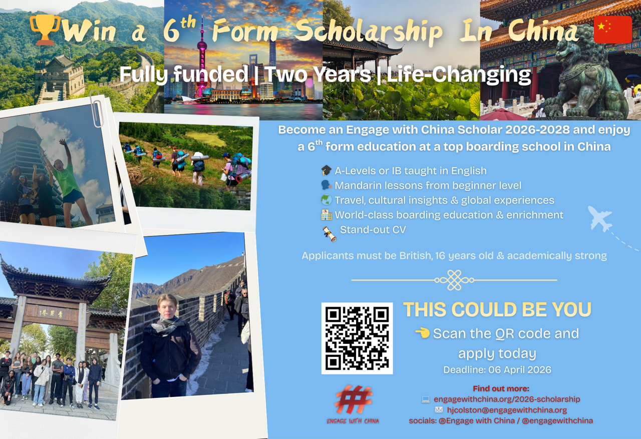 Win a 6th Form Scholarship in China Learn more about how your students can obtain a scholarship to spend time on placement in Chinahttps://engagewithchina.org/2026-scholarship/ EducationWill PowellMarch 18, 2026 Facebook0 Twitter LinkedIn0 Reddit Tumblr 0 Likes